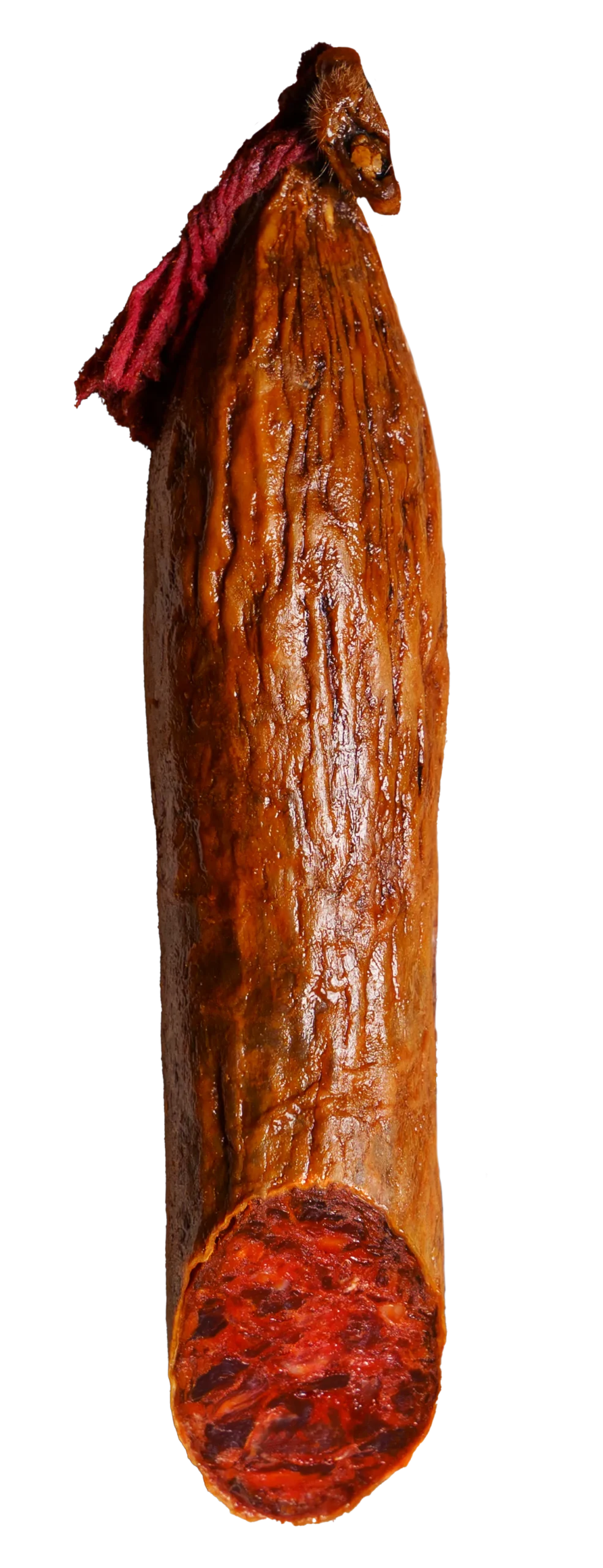 Chorizo Ibérico Bellota, elaborado exclusivamente con las partes nobles del cerdo ibérico de bellota: pluma, presa, solomillo, aguja, abanico y magro ibérico.